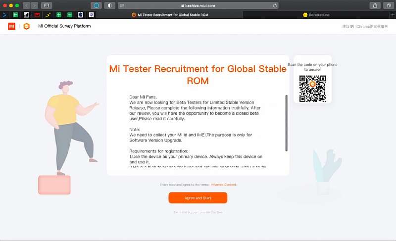 - Зайдите на сайт тестировщиков MIUI и согласитесь с правилами, нажав «Agree and Start».