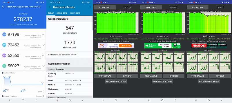 По остальным характеристикам тоже полный порядок: в M51 впихнули 6/128 ГБ памяти с отдельным слотом под флешку, 3.5 мм разъем для наушников, NFC. Фронталка получила разрешение 32 МП, а основная камера состоит из четырех датчиков на 64, 12, 5 и 5 МП. За свои деньги девайс прилично фотографирует, и у него есть скрытый потенциал в лице Google-камеры для любителей заморочиться с настройками.