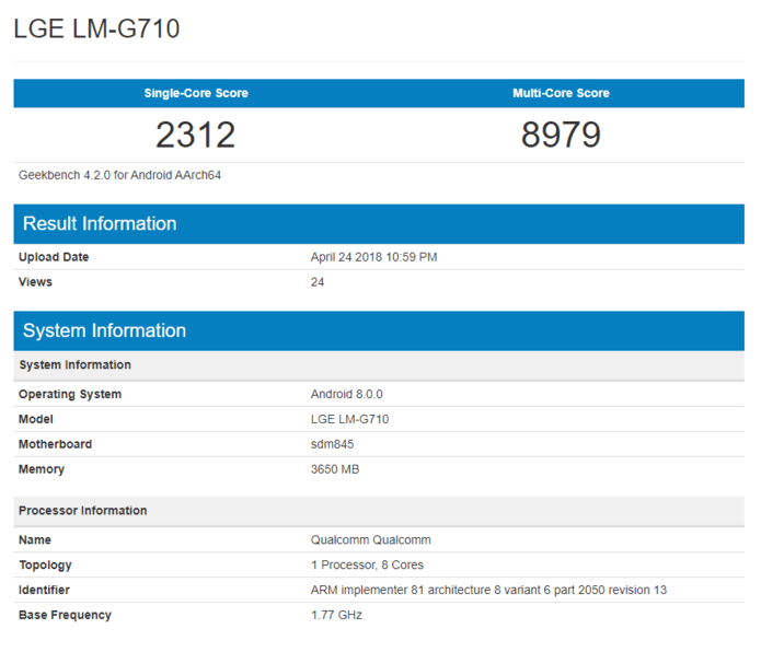 В базе данных бенчмарка Geekbench появились результаты тестирования флагмана южнокорейской компании LG G7 ThinQ, которые раскрыли некоторые ключевые характеристики смартфона.