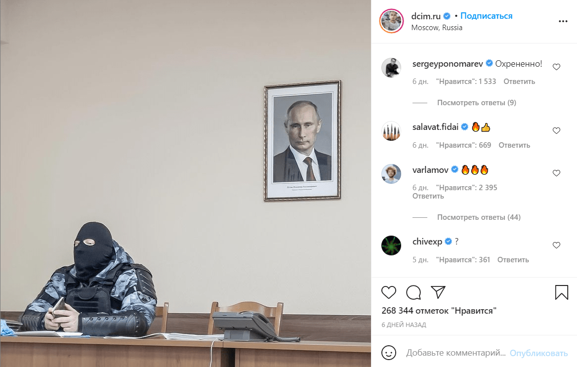Фотограф Дмитрий Марков известен своими снимками российской провинции. На них он без прикрас демонстрирует все стороны жизни простых людей, порой неприглядные, но насквозь правдивые и жутко атмосферные. Очередной фактурный снимок Марков сделал 2-го февраля в московском ОВД, куда его привезли оформлять после несанкционированного митинга в поддержку Алексея Навального.