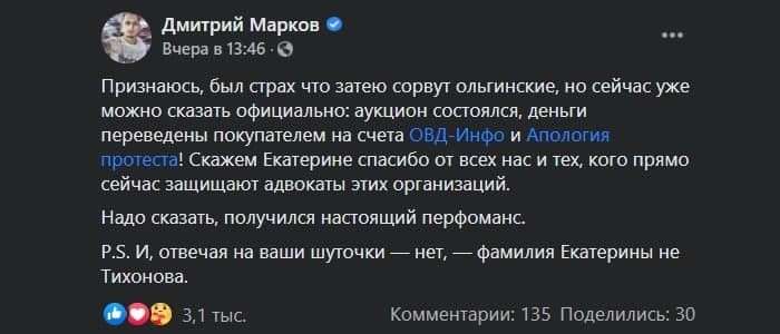 Стартовая цена на единственный лот — распечатанную фотографию с личной подписью Маркова в рамке — была весьма скромной, всего-то 10 тысяч рублей. Но всего за сутки, а именно столько длился аукцион, достигла 2-х миллионов рублей. Новой владелицей фотографии стала некая Екатерина, данные которой до сих пор остаются в тайне.