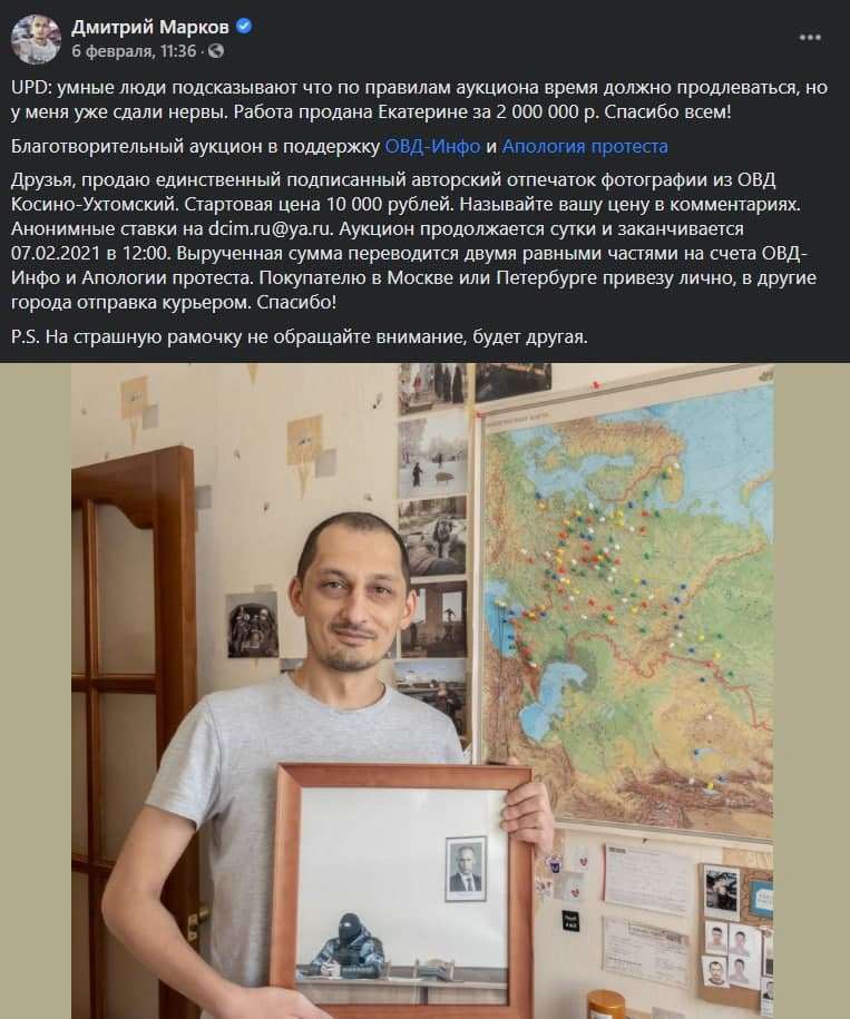 Снимок быстро разлетелся по всему интернету, был признан символом прошедших акций протеста и породил сотни фотожаб. А самому Маркову пришла идея выставить его на аукцион. Не ради собственной выгоды — все деньги с продажи планировалось передать организациям «ОВД-Инфо» и «Апология протеста», которые оказывают поддержку всем, задержанным властями.
