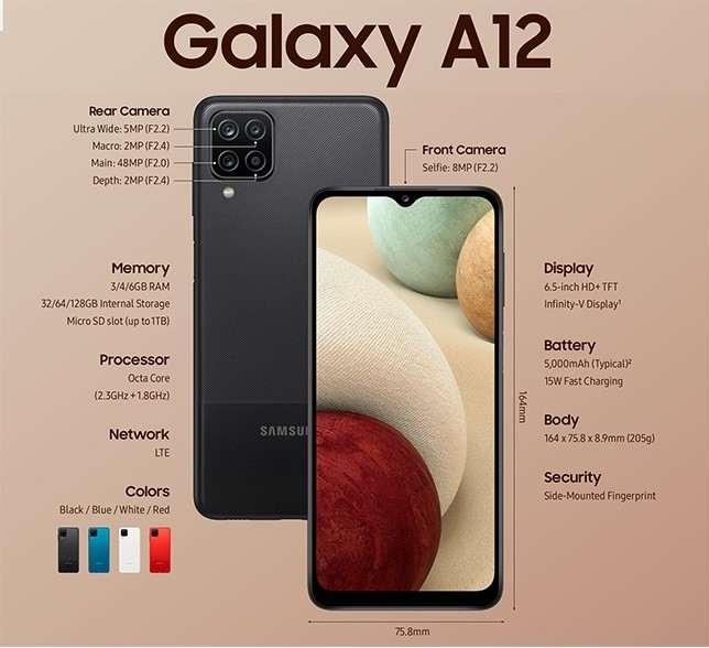 Доступно четыре цвета Galaxy A12: черный, синий, белый и красный. Корпус устройства сделан из пластика, с текстурированным покрытием для улучшения хвата.