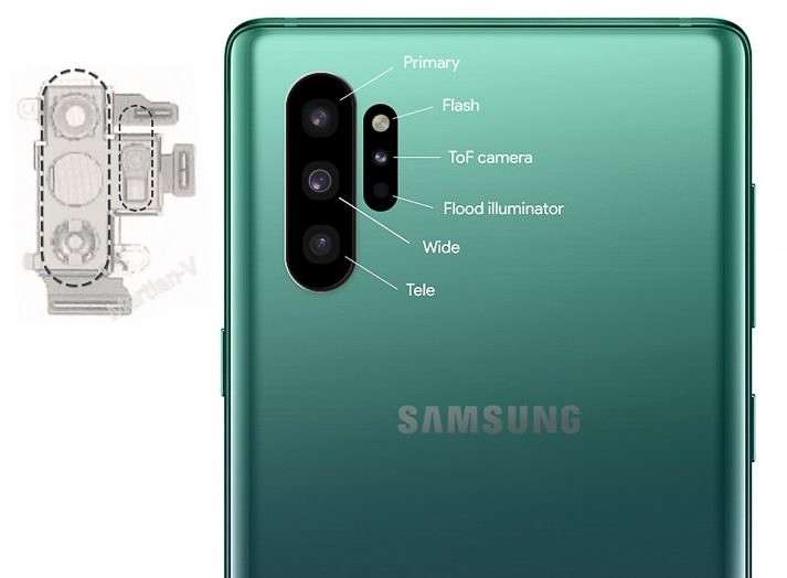 Камеру Note 10 неизбежно позаимствует у Galaxy S10. Многочисленные утечки свидетельствуют, что обе версии фаблета получат тройную основную камеру, но в Pro будет дополнительный ToF-сенсор, как у S10 5G. Инсайдеры прогнозируют следующую конфигурацию: