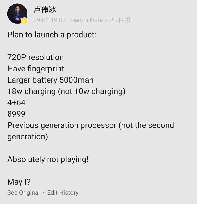 По всей видимости, Xiaomi не планирует делать больших перерывов после анонса Redmi Note 8 и вскоре представит новый ультрабюджетник Redmi 8A. Информацией о характеристиках смартфона сегодня поделился сам глава компании, Лю Вейбинг.