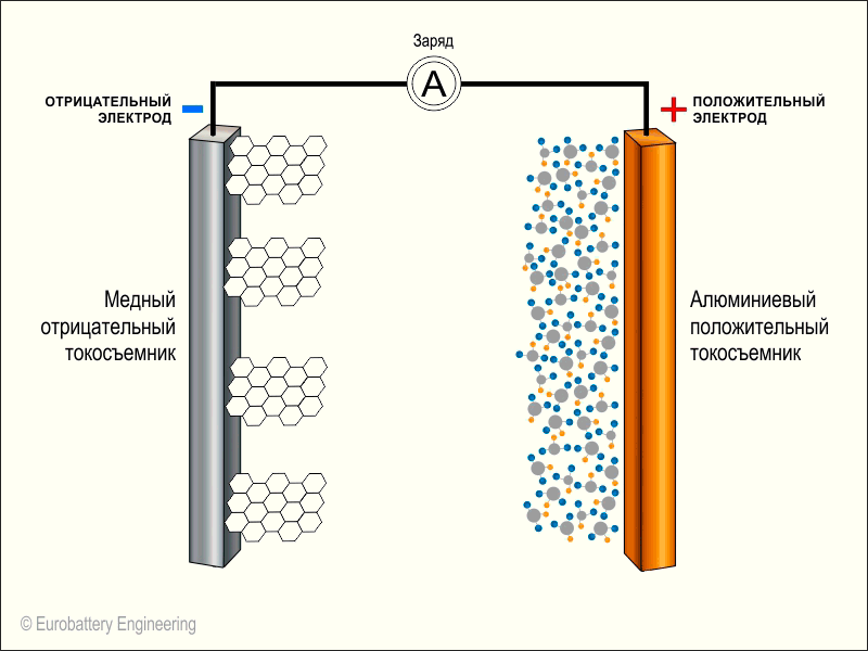 Если вкратце и очень просто: внутри аккумулятора есть тысячи ячеек с жидкостью (это электролит), а между ячейками находятся «вставки» из алюминиевой и медной фольги (это электроды). При подключении к розетке ток проходит через электролит, и поступает на электроды, которые накапливают заряд.