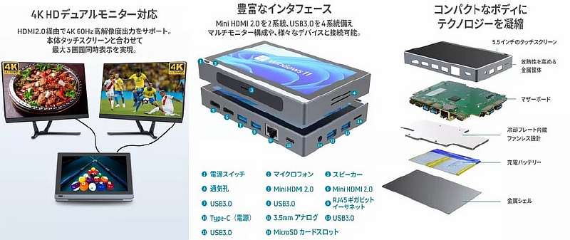 Кроме того, в этом миниатюрном устройстве есть модули Wi-Fi 6 и Bluetooth 5.2, а также довольно большое количество различных разъемов: 4x USB 3.0, USB Type-C, Gigabit Ethernet , 2x Mini HDMI 2.0 (поддерживаются 4К мониторы), слот для карты microSD и порт 3.5 мм. Все это питается от аккумулятора емкостью 2500 мАч и работает под управлением операционной системы Windows 11 Pro.