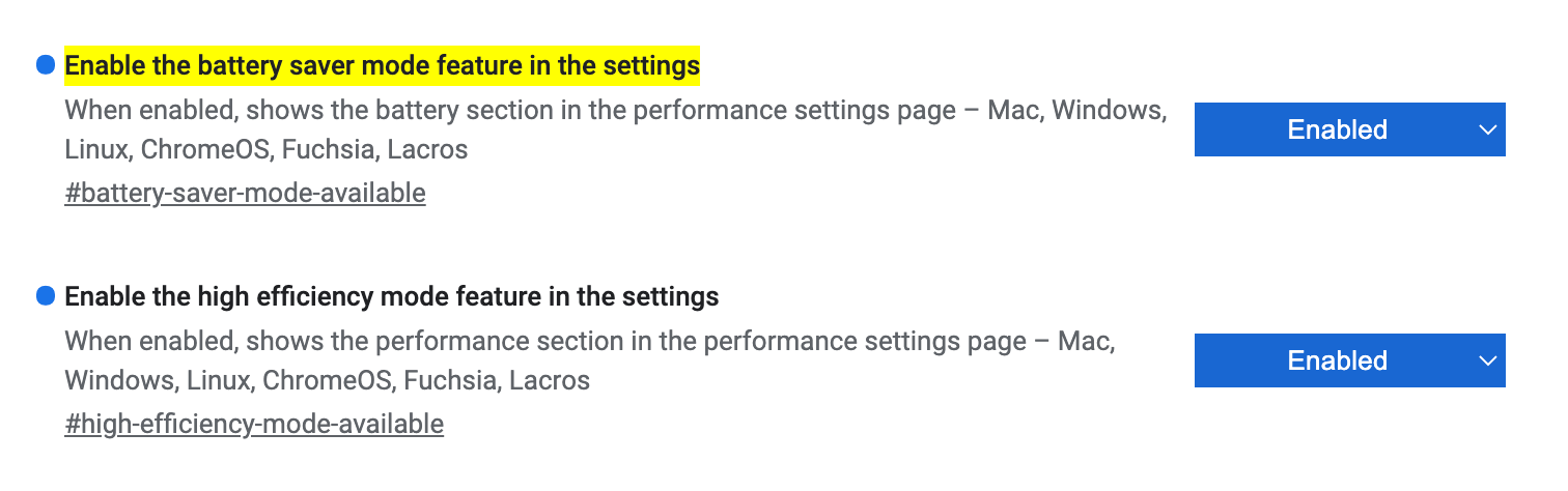 - Экономия батареи: chrome://flags/#battery-saver-mode-available
