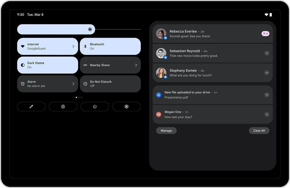 Android 12L лучше распоряжается пространством экрана, доступным пользователю. Вместо одной большой шторки с уведомлениями панель разделена на две колонки — с входящими сообщениями и настройками по отдельности.