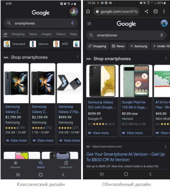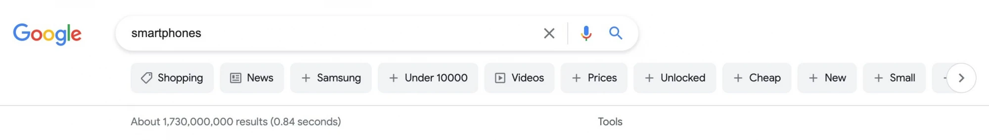 Теперь, когда пользователь вводит запрос, Google сам предложит несколько релевантных тегов, на которые можно нажать. Например, при запросе смартфоны появятся теги Samsung или «до 300 долларов». Среди этих тегов могут появится и уже знакомые вкладки.