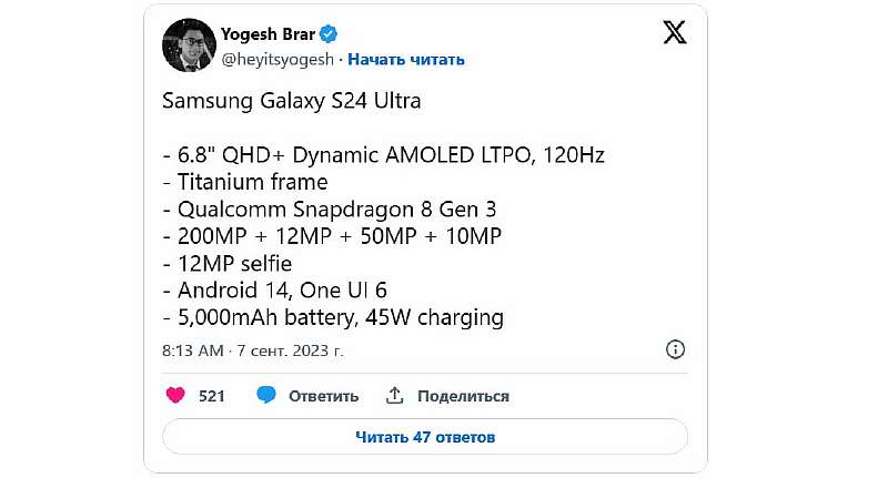 Самыми обсуждаемым смартфоном последних дней, несомненно, является грядущий iPhone 15, но инсайдер Йогеш Брар решил хотя бы ненадолго отвлечь наше внимание – он опубликовал ключевые характеристики грядущего флагмана Samsung Galaxy S24 Ultra. И поскольку у Брара крайне высокий процент точных предсказаний, не стоит относиться к этой утечке легкомысленно.