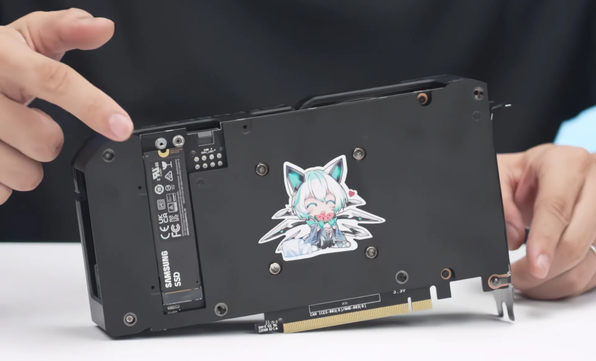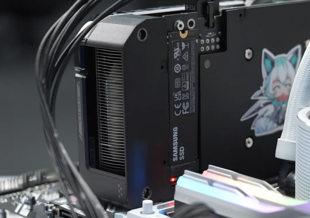 Компания продемонстрировал прототип GeForce RTX 4060 Ti с двумя слотами M.2-2280 и интерфейсом PCIe 4.0 x4, один из которых находится на передней панели, а другой на обратной стороне печатной платы. На видео в них установлен накопитель Samsung 980 PRO емкостью 2 ТБ.