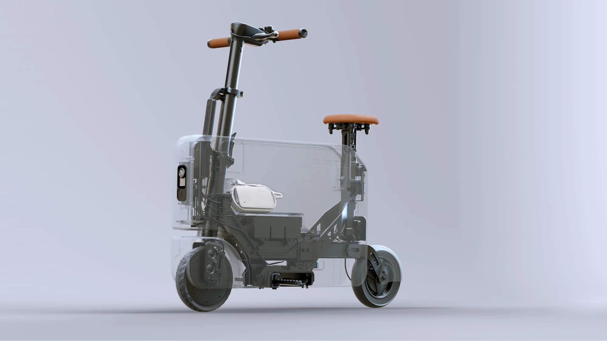Скутер обладает сверхкомпактной складной конструкцией – руль, седло, подножки и колеса можно спрятать внутри, чтобы переносить его в общественном транспорте либо хранить в багажнике автомобиля. Размеры в сложенном виде составляют 74х53.5х9.4 см.