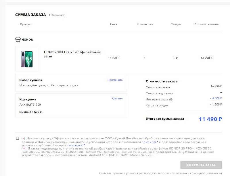 Что по цене? Honor 10X Lite стоит 16 990 рублей, но до 20 ноября его можно взять по акции за 12 990 рублей. Также дополнительную скидку предлагают при регистрации на сайте Honor – у авторизованных пользователей при оформлении заказа есть место для промокода: вбиваем AHX10LITE1500 и получаем итоговую цену 11 490 рублей. Вот ссылка на акцию.