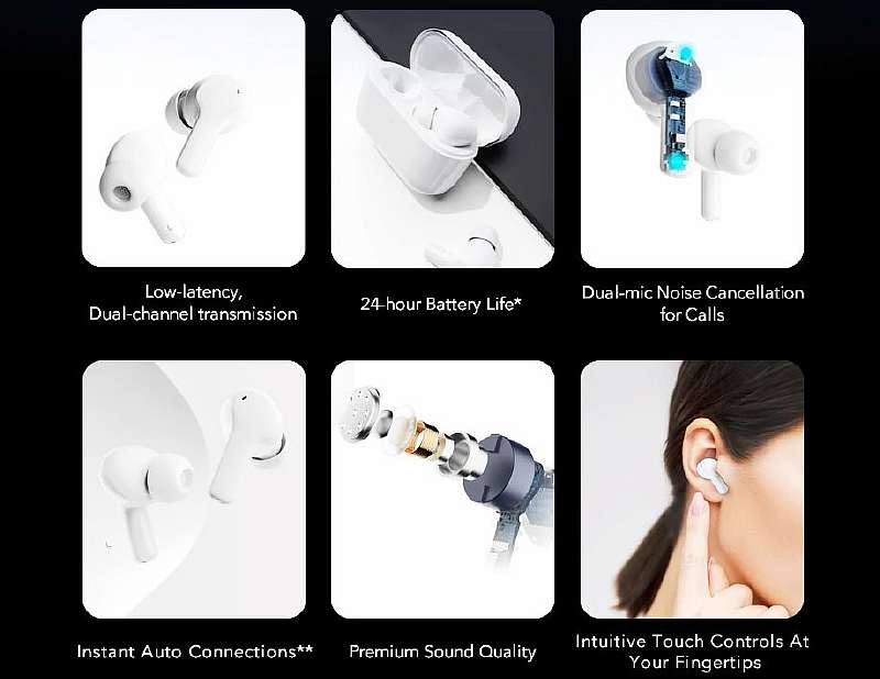 Из дополнительных фишек заявлена система шумоподавления во время разговора, для которой в каждый из наушников встроено по 2 микрофона. В Earbuds X1 нет датчика, который бы останавливал воспроизведение при извлечении наушников, но ставить музыку на паузу и переключать треки можно с помощью сенсорного управления.