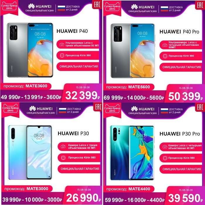 Начнем с новинок. Huawei P40 на распродаже отдают всего за 32 399 рублей с учетом купона и промокода MATE3600. В официальной рознице он стоит 40 тысяч, и даже на сером рынке моделью торгуют на 3-4 тысячи дороже. Тут же вы получаете девайс напрямую от производителя, с оф. гарантией и быстрой доставкой из России. Вот линк на скидку.