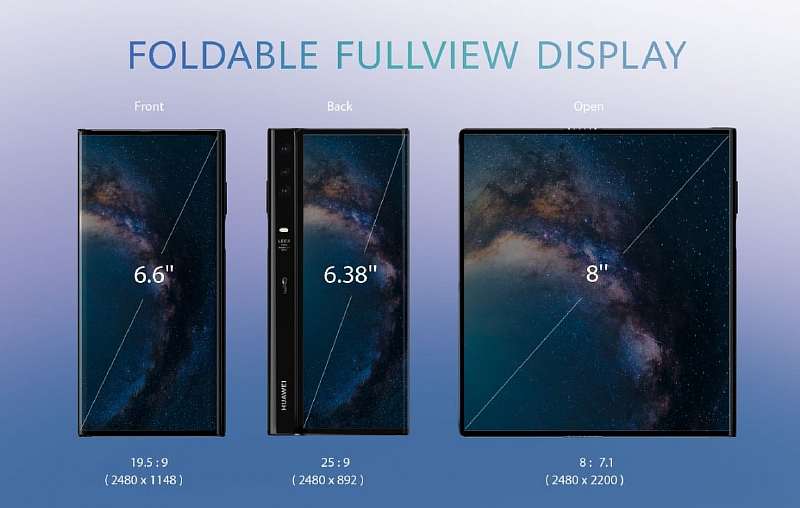 В отличие от Galaxy F, большой эластичный OLED экран в Mate X расположен на внешней стороне корпуса. Когда устройство находится в закрытом состоянии его часть выполняет функцию наружного экрана диагональю 6.6 дюйма (2480х1148px) с соотношением сторон 19.5:9, а при раскрытии корпуса перед пользователем предстает вся 8 дюймовая матрица с совокупным разрешением 2840х220 точек. Толщина рамок вокруг дисплея Mate X минимальная, также крайне мала толщина самого устройства – 5.4 мм в развернутом виде и 11 мм в сложенном.