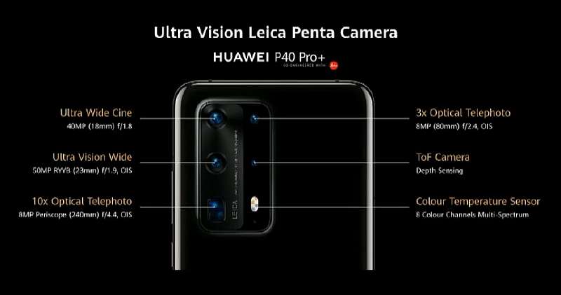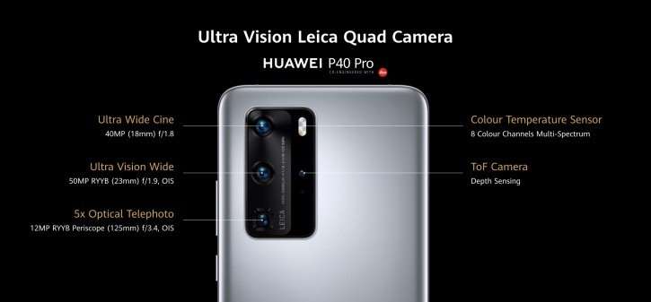 P40 Pro сохранил перископическую зум камеру от P30 Pro, которая имеет разрешение 12 МП и предлагает 5-кратный зум с эквивалентным фокусным расстоянием 125 мм. Также заявлена сверхширокоугольная Cine Lens камера на 40 МП с 18-мм объективом f/1.8, которая дополнена ToF датчиком и отдельным сенсором для измерения цветовой температуры.