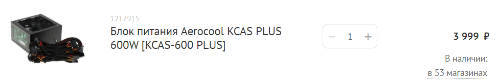 Блок питания, мы выбрали AeroCool KCAS Plus 600W (не самый лучший, но из дешевых — сойдет, и есть запас для установки второй видеокарты, дополнительной оперативки или более мощного процессора), за 4000 р. в DNS: