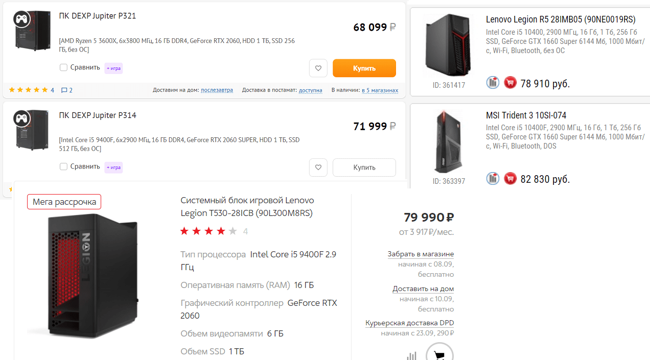 Готовый системник с игровым железом (16 ГБ ОЗУ, проц уровня i5/Ryzen 5 3600x, 1 ТБ HDD + 256 ГБ SSD, видеокарта GeForce RTX 2060 6 ГБ) будет стоить в районе 70-85 тысяч рублей, в зависимости от магазина. Скорее всего — сами комплектующие там будут не очень: бюджетные версии 2060 с 1 кулером, слабоватый БП без запаса, самые простые материнка, хард и ОЗУ.