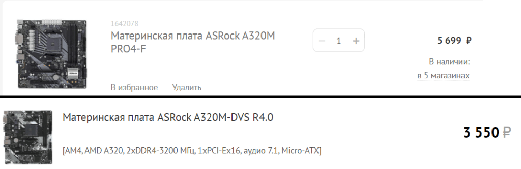 Материнка ASRock A320M PRO4-F (2 слота PCI-E x16 под 2 видеокарты, 4 слота под планки ОЗУ): 5700 р. в DNS. Можно взять самую простую материнку под АМ4 за 3500 р. (но в нее влезет 2 планки оперативки и 1 видеокарта).