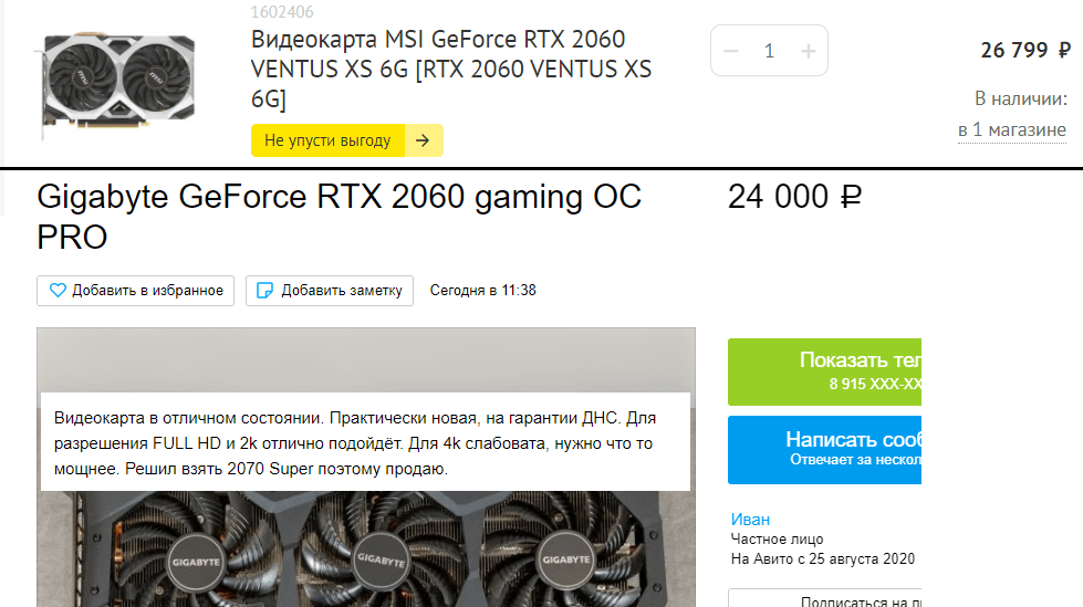 Видеокарта GeForce RTX 2060 6 Гб с 2 кулерами: ~27 т. р. в DNS (или 22-24 на Авито с чеком и на гарантии):
