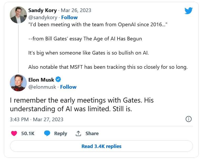 Генеральный директор SpaceX, Tesla и Twitter решил, что сейчас самое время снова пообщаться с Биллом Гейтсом. Причиной «наезда» стал искусственный интеллект.