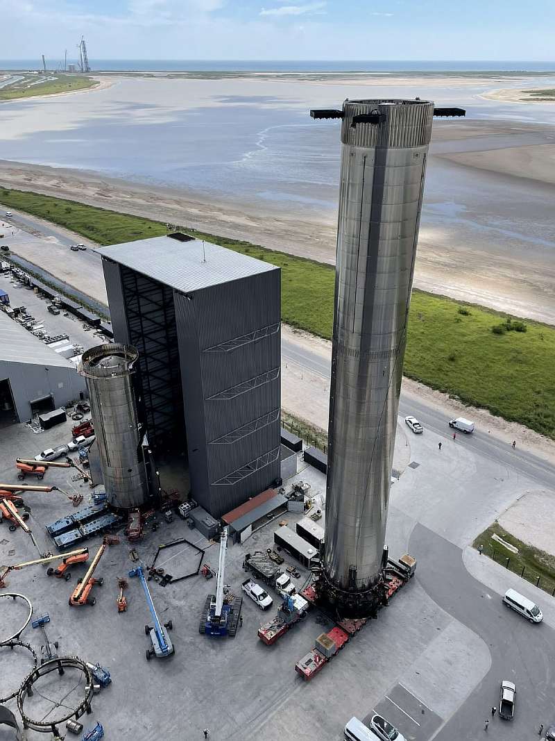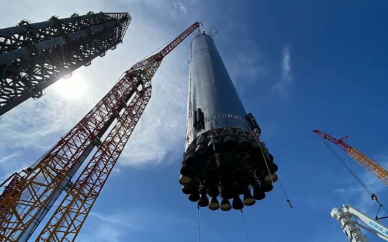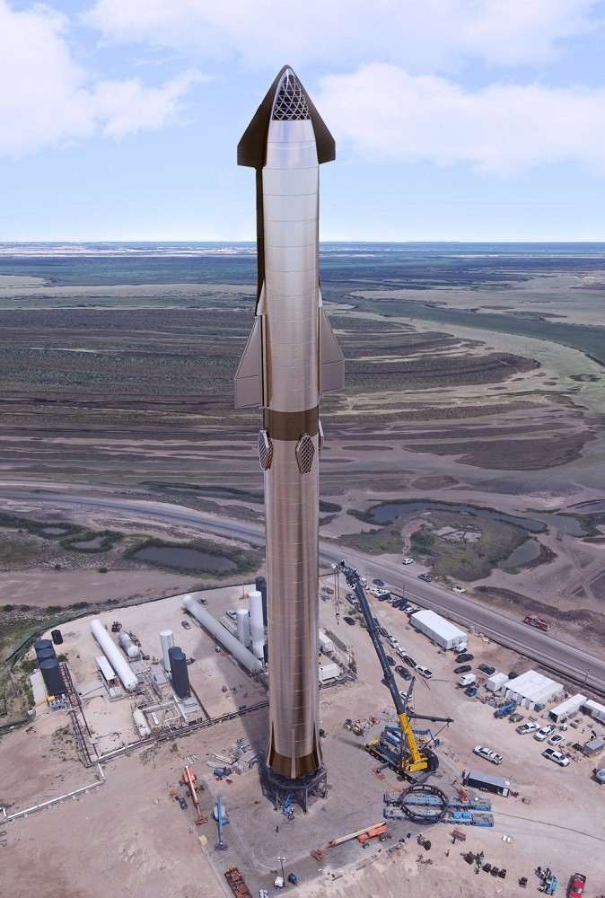 Общая высота ракеты Super Heavy составила 70 м. За ночь на нее установили 29 кислородно-метановых двигателей Raptor высотой 3.1 м и диаметром 1.3 м каждый. А вчера, 5 августа, ракету переместили на орбитальную стартовую площадку