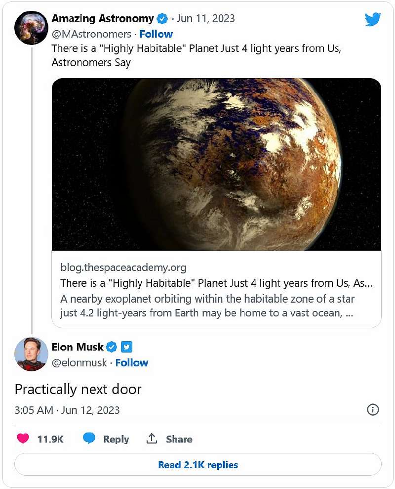 Внимание босса SpaceX привлекло исследование The Space Academy, которое рассказывает о планете Proxima Centauri B. Это планета размером с Землю, которая была обнаружена в 2016 году и считается учеными особенно многообещающим местом для поиска внеземной жизни, поскольку она расположена в так называемой «обитаемой зоне», на таком расстоянии от своей родительской звезды, что жидкая вода не должна ни испаряться, ни замерзать на ее поверхности.