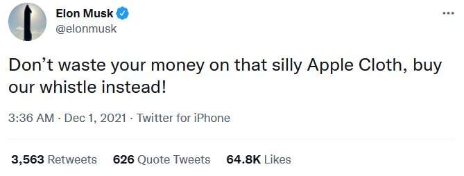 Илон Маск в своем Twitter-аккаунте сообщил, что свисток является ответом Tesla на фирменную салфетку Apple. Миллиардер призвал игнорировать бесполезную яблочную тряпку, а потратиться на элегантный свисток, который был выпущен ограниченным тиражом.