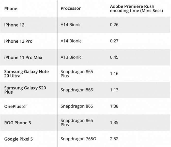 Можно поспорить, что синтетические тесты имеют мало общего с реальной производительностью, но и тут iPhone 12 не оставляет шансов флагманам на Android. В прикладном тесте перекодирования 4К видео в FullHD в приложении Adobe Premiere Rush новое яблоко с результатом в 26 секунд обогнало флагман Samsung в три раза, а Google Pixel 5 на Snapdragon 765G – почти в 10 раз.