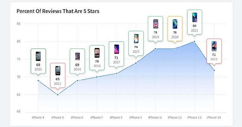 В целом рейтинг iPhone 14 можно оценить как хороший — 72% пользователей поставили гаджету 5 звезд. Загвоздка в том, что у iPhone 13 этот показатель был выше — 80% пятизвездочных отзывов. А у двух предшественников — на уровне 78%. У «старших» моделей дела не намного лучше, iPhone 14 Pro и iPhone 14 Pro Max имеют самый низкий рейтинг за последние 4 года.