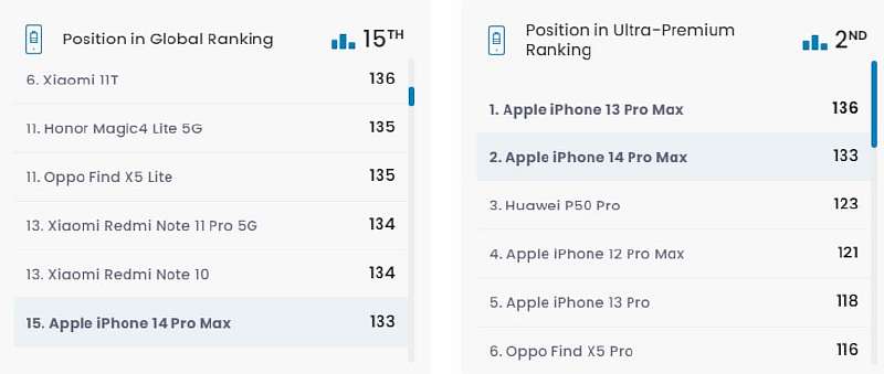 По итогу в общем рейтинге автономности от портала DxOMark iPhone 14 Pro Max занял 15-е место, уступив бюджетному Redmi Note 10. Однако, в топе ультрафлагманов модель занимает вторую строчку, уступая только iPhone 13 Pro Max. Примечательно, что предшественник лучше новинки в плане автономности абсолютно по всем показателям.