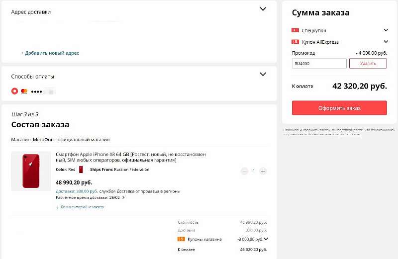 Чтобы взять iPhone XR за 41 991 рубль нужно использовать купон продавца на 3000 рублей, его раздают на странице товара, и при оформлении заказа ввести промокод RU4000, который скинет еще 4000 рублей. Учитывайте, что при доставке в регионы к итоговой стоимости будет добавлена стоимость пересылки.