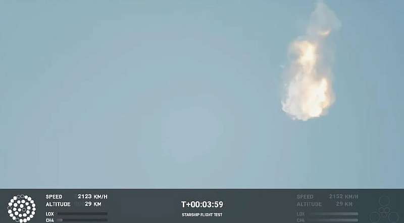 Перед разделением ступеней (корабля и ускорителя) должно было произойти легкое вращение. По плану, после начала вращения двигатели Super Heavy должны отключиться, после чего Starship устремляется вверх уже на тяге своих движков. Однако на высоте 39-и км ракета потеряла скорость, вошла в неконтролируемое вращение (сделала минимум 3 оборота) и наконец с грохотом взорвалась. Скорее всего, это с отказом нескольких двигателей на первой ступени.