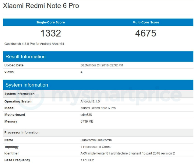 Один из самых ожидаемых бюджетных смартфонов текущего года – Xiaomi Redmi Note 6 Pro, замечен в базе данных бенчмарка GeekBench. Тестирование раскрыло некоторые спецификации гаджета, в частности его процессор. Никаких изменений по аппаратной платформе в сравнении с предшественником не будет, ставка сделана на все тот же восьмиядерный Snapdragon 636. Чипсет дополнят 3/4 ГБ оперативной и 32/64 ГБ постоянной памяти.