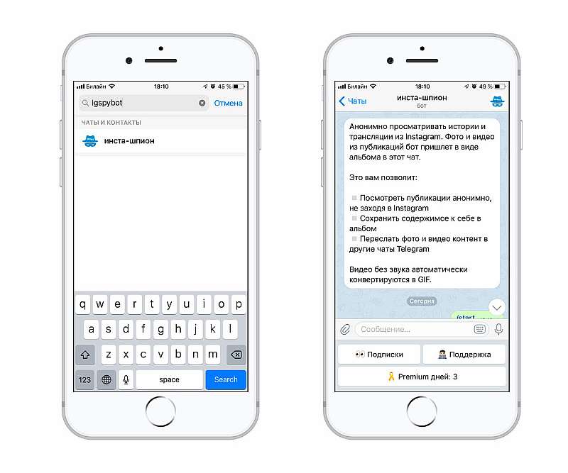 Среди огромного количества ботов для Telegram есть и такой, с помощью которого можно тайно просматривать истории в Instagram. Зайдите в поисковую строку мессенджера и введите IGSpyBot. Щелкните по кнопке «Запустить», и бот отправит краткую инструкцию по использованию. Принцип работы простой — вы отправляете боту имя аккаунта, а бот присылает вам последние stories с него. С помощью «инста шпиона» можно даже подписаться на пользователя, тогда бот будет отправлять вам все свежие истории автоматически по мере их появления. Во всех случаях владелец профиля никак не узнает, что его истории кто-то просматривал.