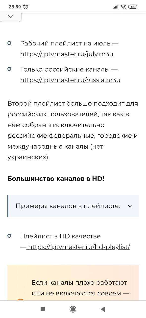 Где его взять: плейлисты можно нагуглить (например, по запросу «бесплатные плейлисты iptv» — их выставляют на куче сайтов, вот один из самых популярных). В отличие от платных, бесплатные плейлисты могут со временем переставать работать. Тогда просто ищем новый, открываем, и снова можем смотреть ТВ на смартфоне. Плейлистов на любой вкус и цвет — огромное множество. Вы легко найдете подборки с платными каналами вроде Discovery, National Geographic, спортивные каналы, кино и многое другое.