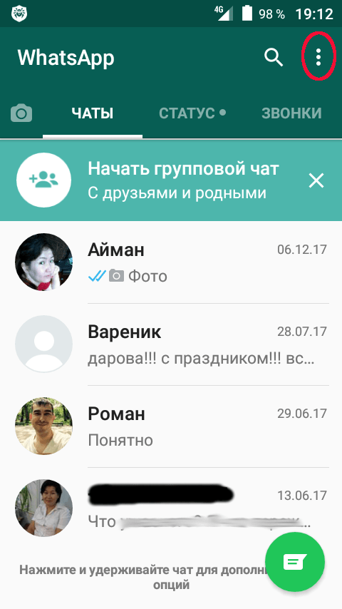- Возьмите свой смартфон и откройте на нем приложение WhatsApp. Справа сверху вы увидите три точки, на которые нужно нажать.