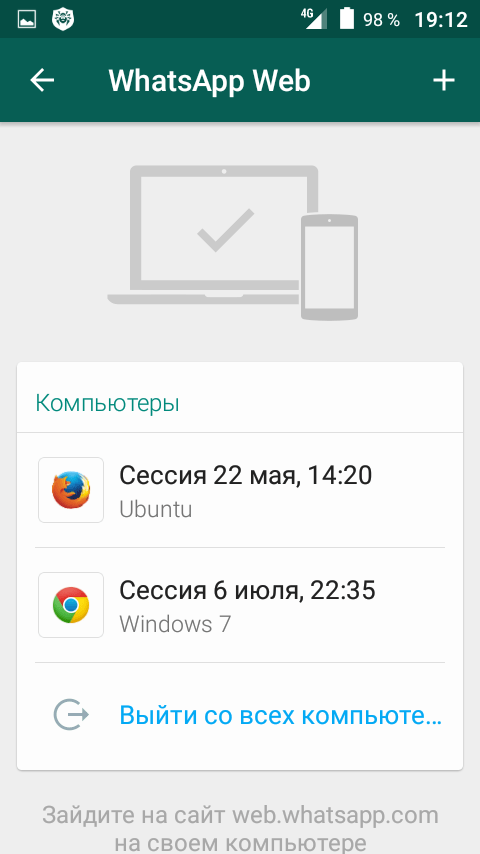 - В новом окне вам покажут уже совершенные сопряжения, а нажав на + вы сможете подключить свой Whatsapp к нужному компьютеру.