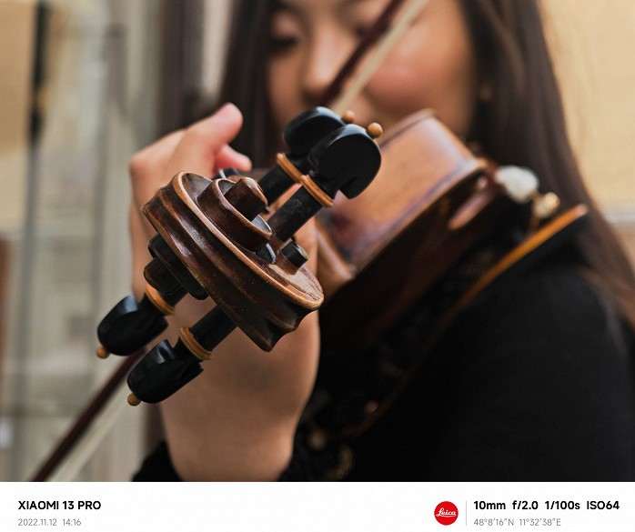 Второе фото сделано на объектив с оптическим приближением, ЭФР которого должен быть в пределах 75-100 мм. «А что насчёт крупного плана? Фокусировка на скрипке и размытый задний фон создают мощный эффект глубины сцены, будто снимок сделан на зеркальный фотоаппарат» – написал Лэй Цзюнь.