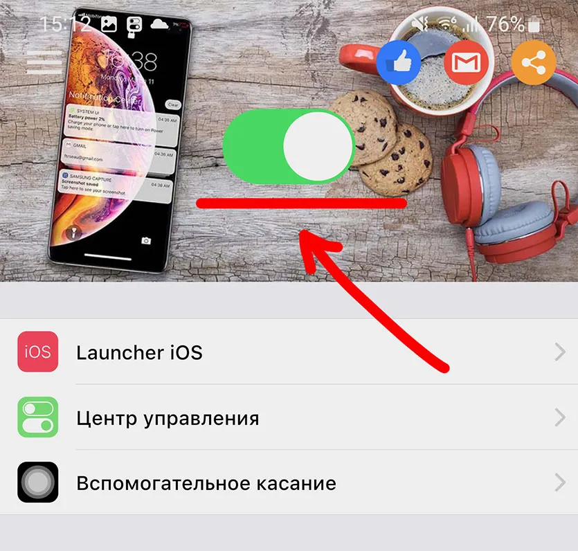 Еще одно приложение, которое нужно скачать, меняет стиль шторки быстрых настроек под дизайн последней iOS 15. Чтобы включить приложение, достаточно запустить его и активировать на главном экране огромный тумблер.