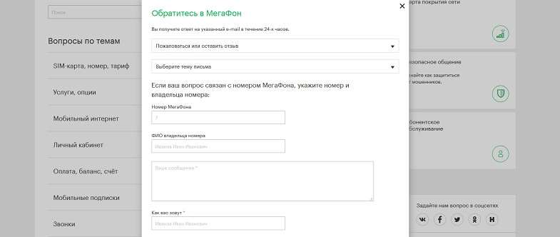 Форму для составления жалобы можно легко найти на официальном сайте «МегаФон». Достаточно прокрутить главную страницу в самый низ и перейти по пункту «Поддержка». В нижнем правом углу будет кнопка «Напишите нам». При нажатии на нее перед вами появится форма с несколькими пунктами и их подробным описанием. Заполняем, отправляем и ждем ответа. Отвечают обычно на контактный e-mail в течение 24-х часов.