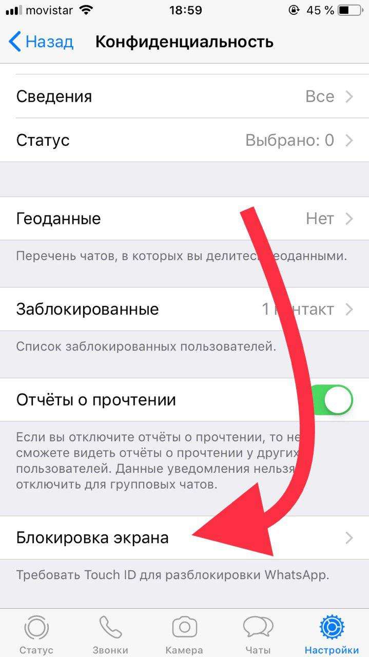 Если вы используете WhatsApp на смартфоне от компании Apple, в качестве пароля можно использовать Touch ID или Face ID. Защита предусмотрена непосредственно приложением, включается она следующим образом: