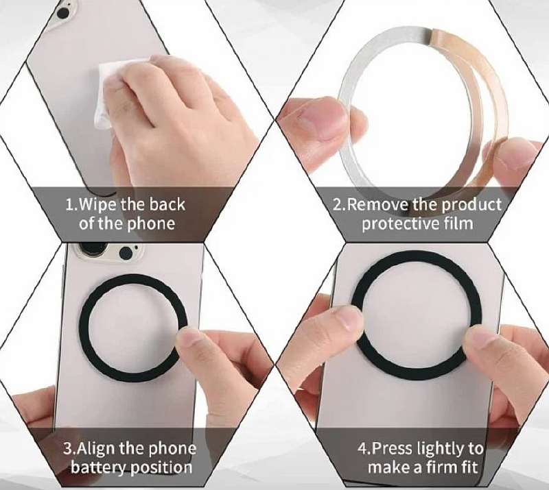 Перед наклеиванием кольца, спинку смартфона нужно обезжирить, а затем удалить пленку и приложить аксессуар таким образом, чтобы логотип Apple был ровно по центру окружности. Затем остаётся только надавить на кольцо, чтобы оно схватилось с задником и всё. MagSafe, который работает со всеми оригинальными аксессуарами Apple, готов.