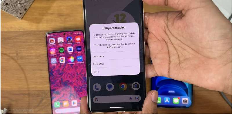 Google Pixel 7 Pro также отключил USB-C и, как Galaxy S23 Ultra, показал предупреждение о жидкости в разъеме до подключения провода. Однако сразу предложил опцию принудительной активации порта, что само по себе небезопасно.