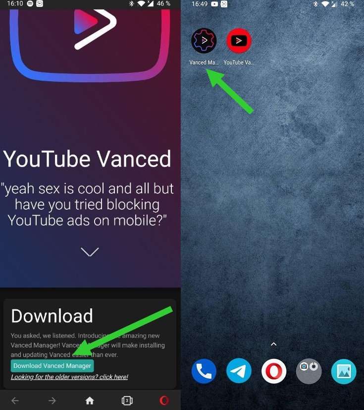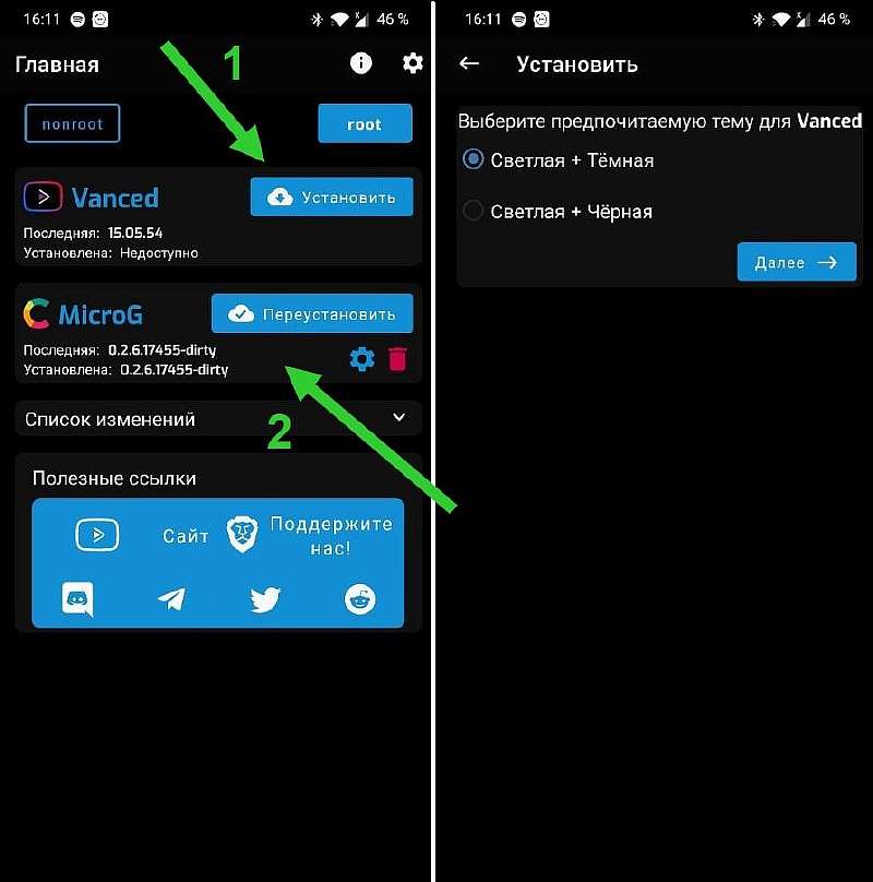 На ваш девайс загрузится apk-файл Vanced Menager, устанавливаем его и заходим в приложение. В инсталляторе указываем, есть ли на смартфоне Root, кликаем по установке Vanced и выбираем желаемую тему оформления. Менеджер попросит разрешение на загрузку файлов из сторонних источников и автоматически установит последнюю версию YouTube Vanced для Android.