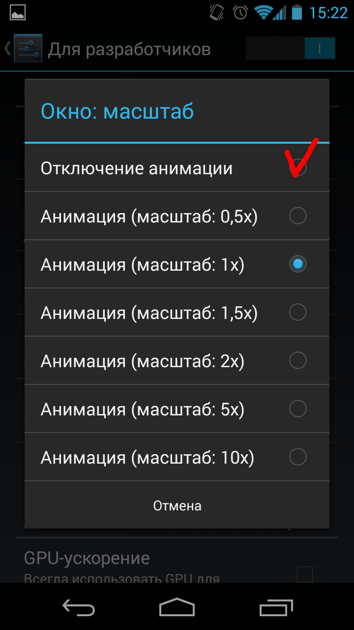 Включенные анимации создают иллюзию плавной работы интерфейса, но в угоду эстетических качеств страдает скорость. Вряд ли имеет смысл платить такую цену на и без того не самом быстром смартфоне. Но это и не обязательно, анимации легко отключаются через настройки для разработчиков, позволяя еще немного ускорить работу гаджета.
