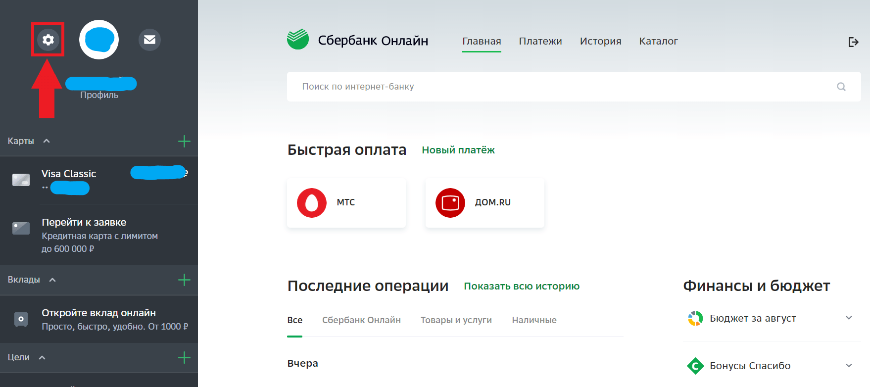Для начала отправляемся в настройки. Не так давно «Сбербанк» кардинально изменил дизайн десктопной версии сервиса, и первое время она может казаться вам непривычной. Чтобы попасть в настройки, нажмите на иконку шестеренки, расположенную в левом верхнем углу, сразу слева от инициалов и имени вашего профиля.