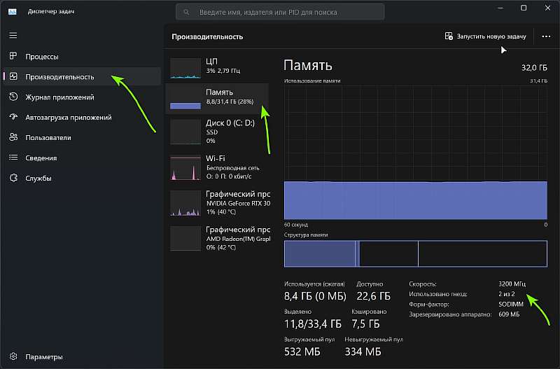 Зажмите комбинацию клавиш Control + Shift + Delete, и перейдите в диспетчер задач. Слева выберите вкладку «Производительность», а чуть правее – «Память». В правом нижем углу окна будет пункт «Использовано гнезд», он то нам и нужен.